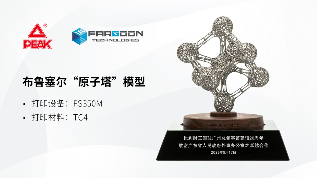 近日,在比利时驻广州总领事馆建馆20周年之际,由匹克精心打造的金属3D打印“原子塔”模型(布鲁塞尔标志性建筑),作为纪念礼物由比利时总领事正式赠予广东省外事办公室。