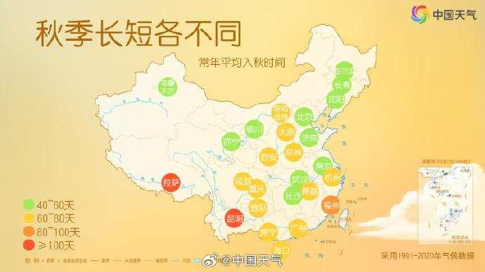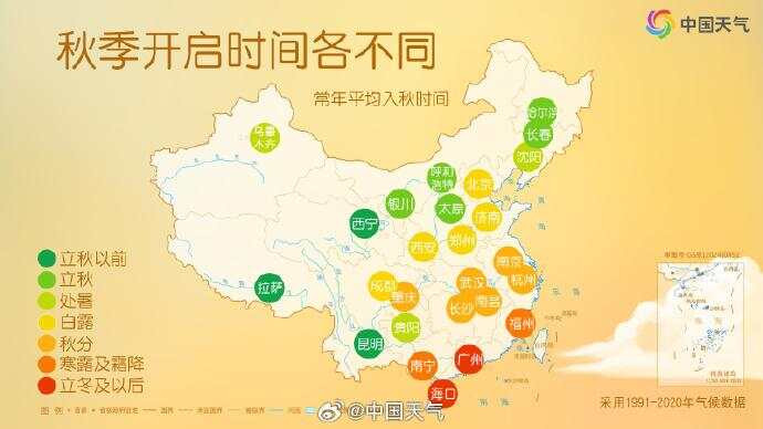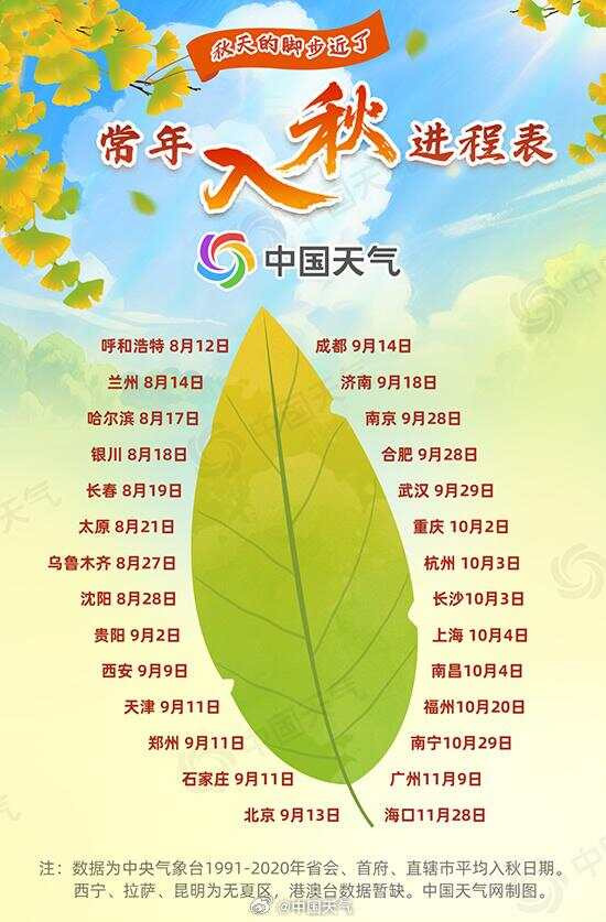 中国气象网统计了1991至2020年省会级城市的入秋日期发现,9月至10月是全国入秋最集中的时间,北京、上海、成都、长沙、武汉、杭州等18个省会级城市会陆续开启入秋进程。而广州,毫无意外地成为了全国最晚入秋的省会城市之一,仅次于海口。