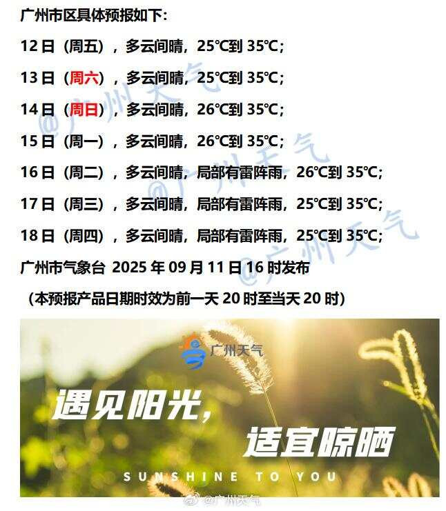 根据@广东天气预测,今天(12日)以及接下来的这个周末,广东的天气都将以高温炎热+局部雷雨天气为主。